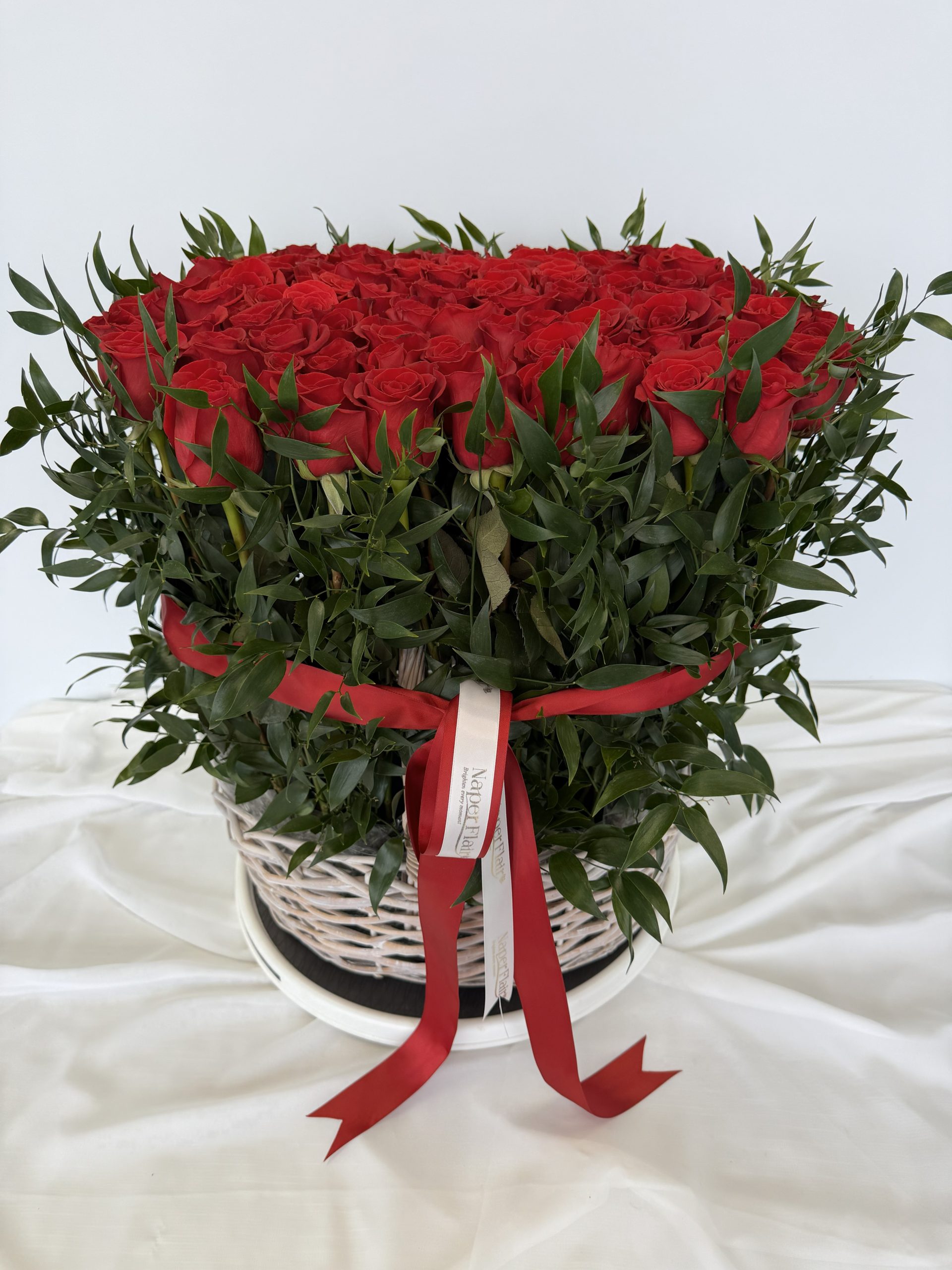 75 Red Roses (70 cm long stem) in large floral basket
